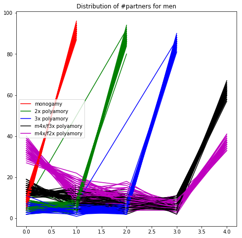 Running the model in a few conditions (monogamy; polyamory where everybody tops out at [2/3] partners; and polyamory where guys are more polyamorous than gals) produced the following results: