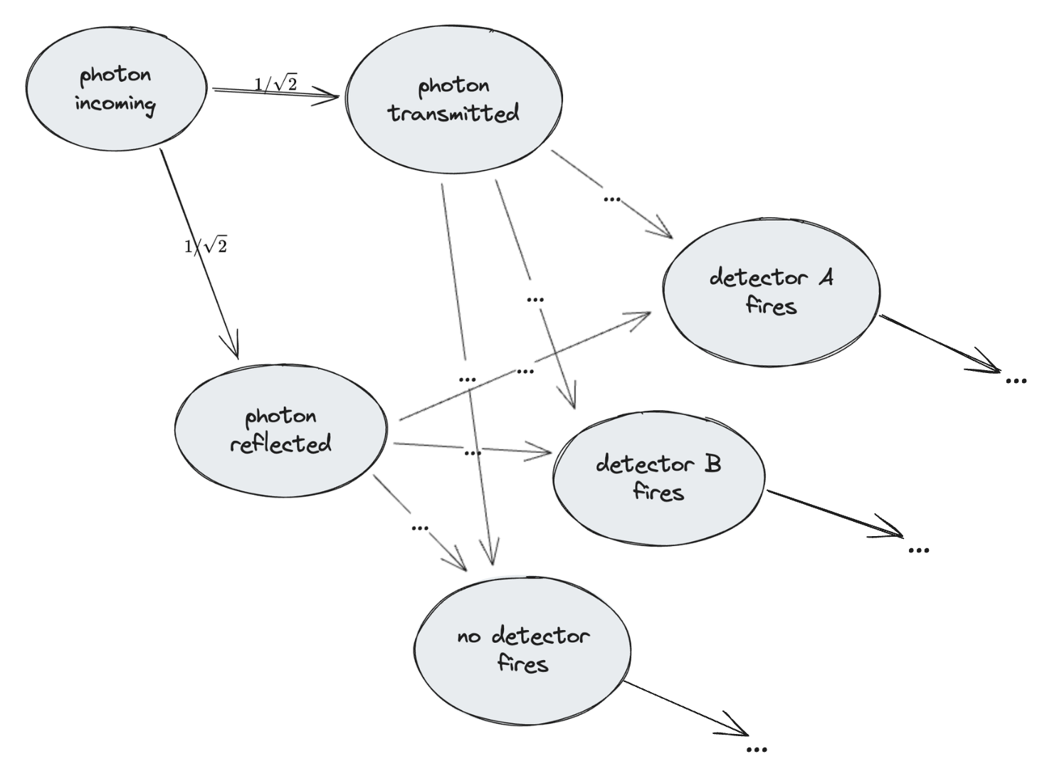 This means that, if you're thinking about a photon interacting with a half-silvered mirror, for example, you don't always need to get into the nitty-gritty of integrating how the wave packet evolves over time; for some purposes at least, you can just doodle a state diagram like...