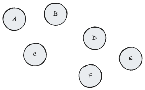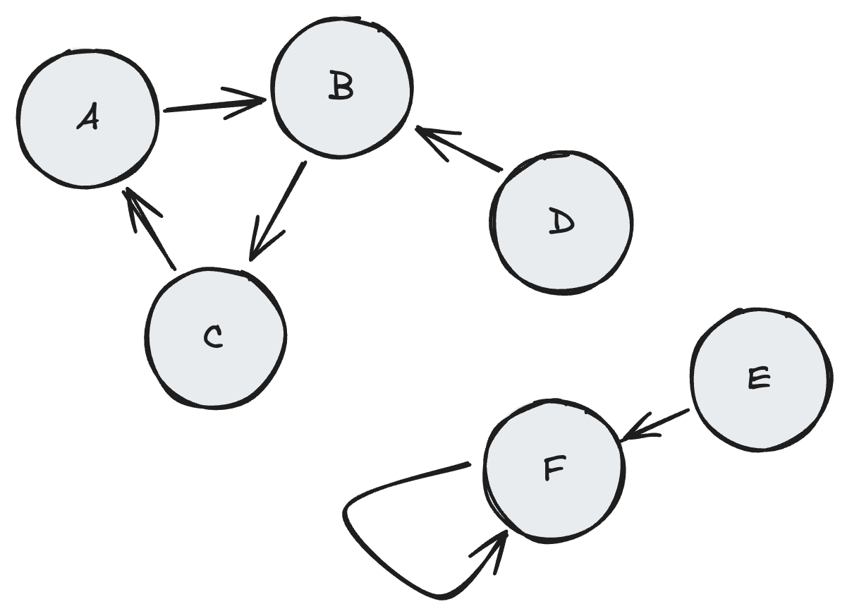 It has 6 states it can be in: \(A\) through \(F\). The arrows depict the dynamics of the system: on each time-step, the system transitions to whatever state its current state's arrow points to.