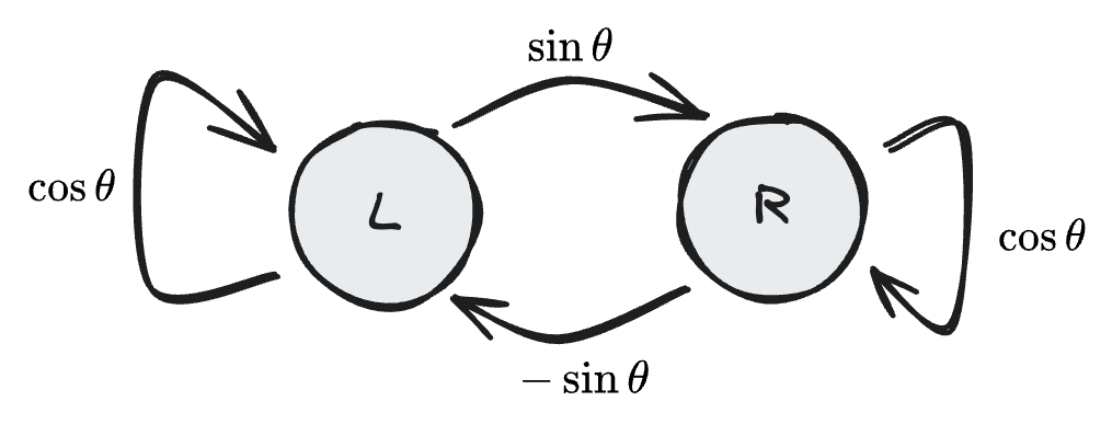 - \(L \to \left[\left(\cos \theta\right)L + \left(\sin \theta\right)R\right] \to \left[\left(\cos 2\theta\right)L + \left(\sin 2\theta\right)R\right] \to \cdots\)